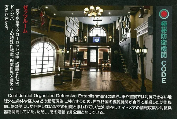 CODE组织,全称Confidential Organized Defensive Establishment,是为了对抗军队和警察无法应付的地球外生命体、怪人等超常现象,由世界各国情报机关联合组织的防卫机关。曾被认为只存在于莫的梦中的虚构组织,但实际上它确实存在,并从事着关于「梦魇」的情报收集和对抗兵器的开发。不过,其活动并未公开。